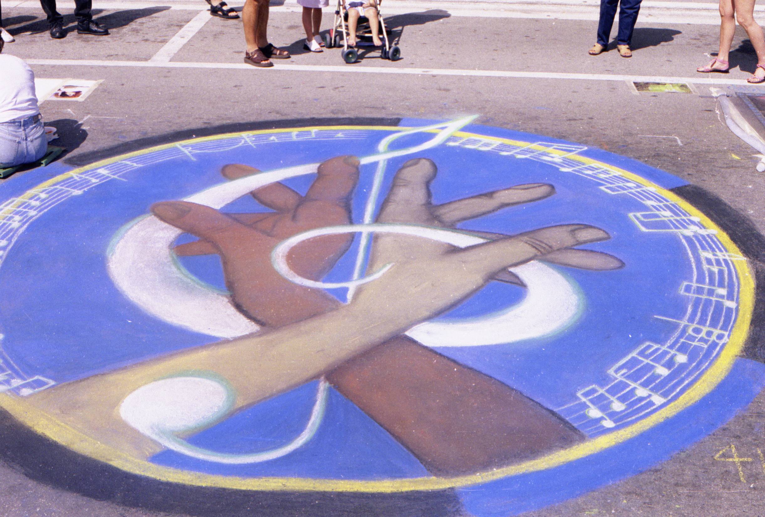 I had this design idea floating around my head for years but it never seemed to fit on anything. I liked the way the hands stretched upward with a treble clef wrapping two hands together (notice the different shades) ... some sort of idea that music brought people together ... or something like that.